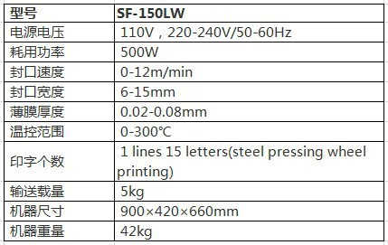 Sf150系列多功能薄膜封口機(jī)適合于塑料袋的封口包裝,采用電子恒溫控制和無(wú)極調(diào)速傅動(dòng):可封合各種材料的塑料薄膜(PE,PP,鋁膜等),還可配上壓痕印字裝置:我司最新款一微電腦控制系統(tǒng),還配有遍數(shù)功能。(FRDl000)